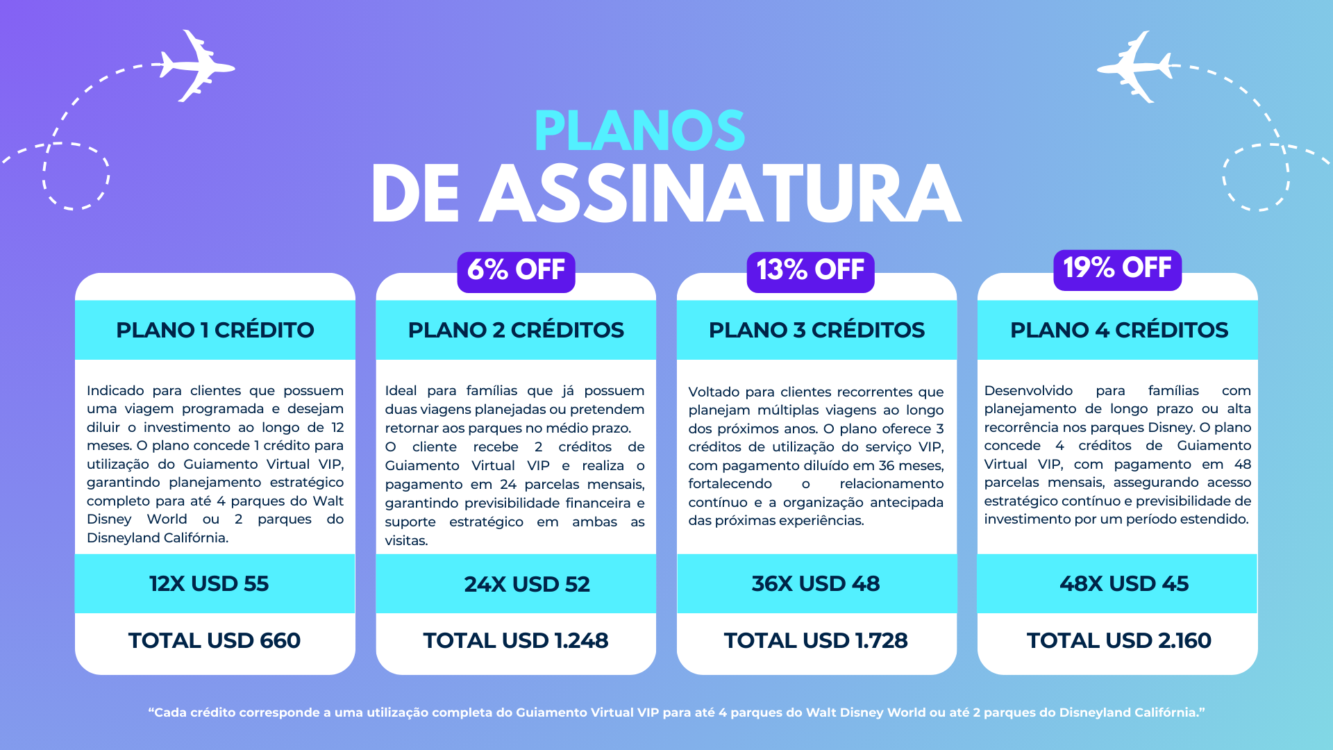 Cada crédito contempla até 6 visitantes e inclui planejamento estratégico completo para até 4 parques do Walt Disney World ou 2 parques da Disneyland Califórnia. Organização personalizada, otimização de tempo e acompanhamento virtual para que cada dia seja vivido da forma mais eficiente — e mágica — possível.
